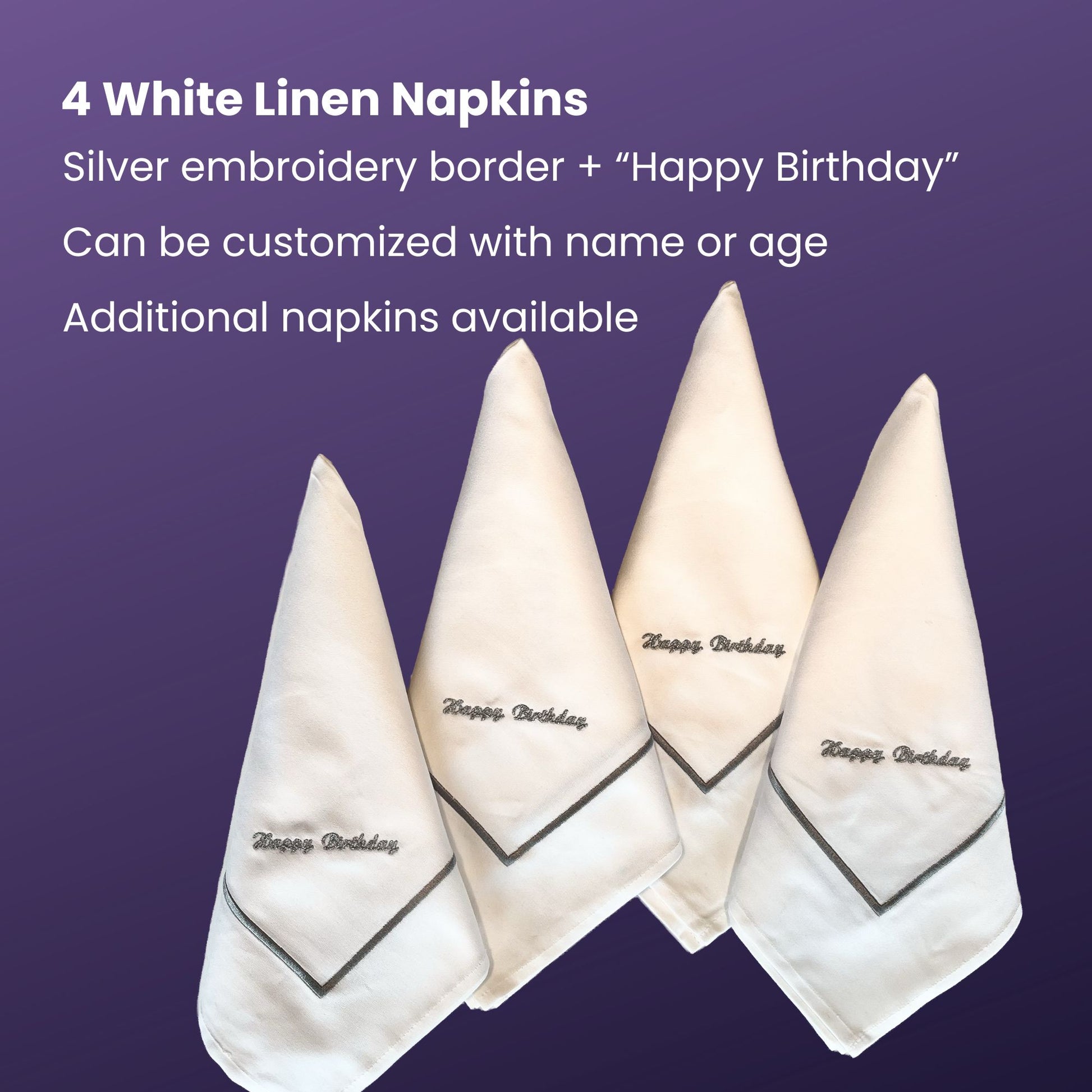 - Silver embroidered "Happy Birthday" and border, white linen Napkins (4)
